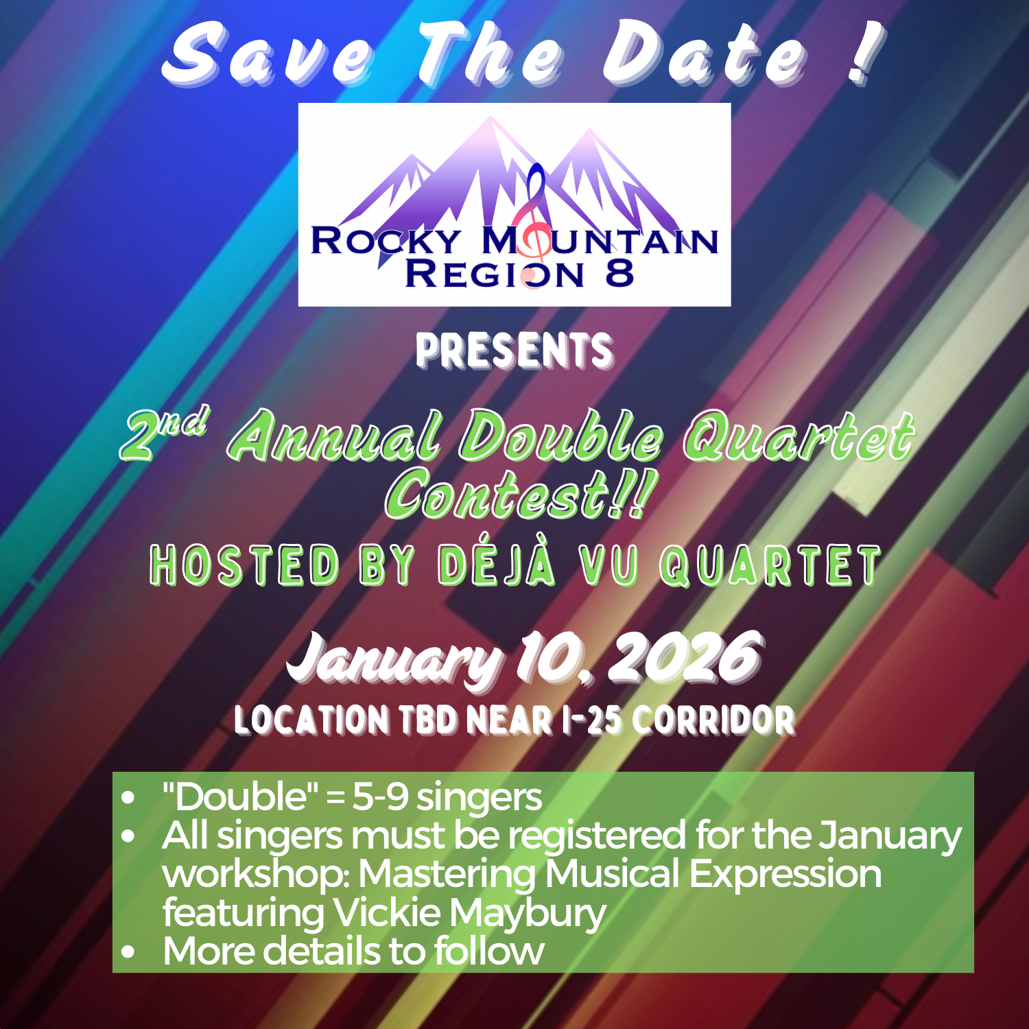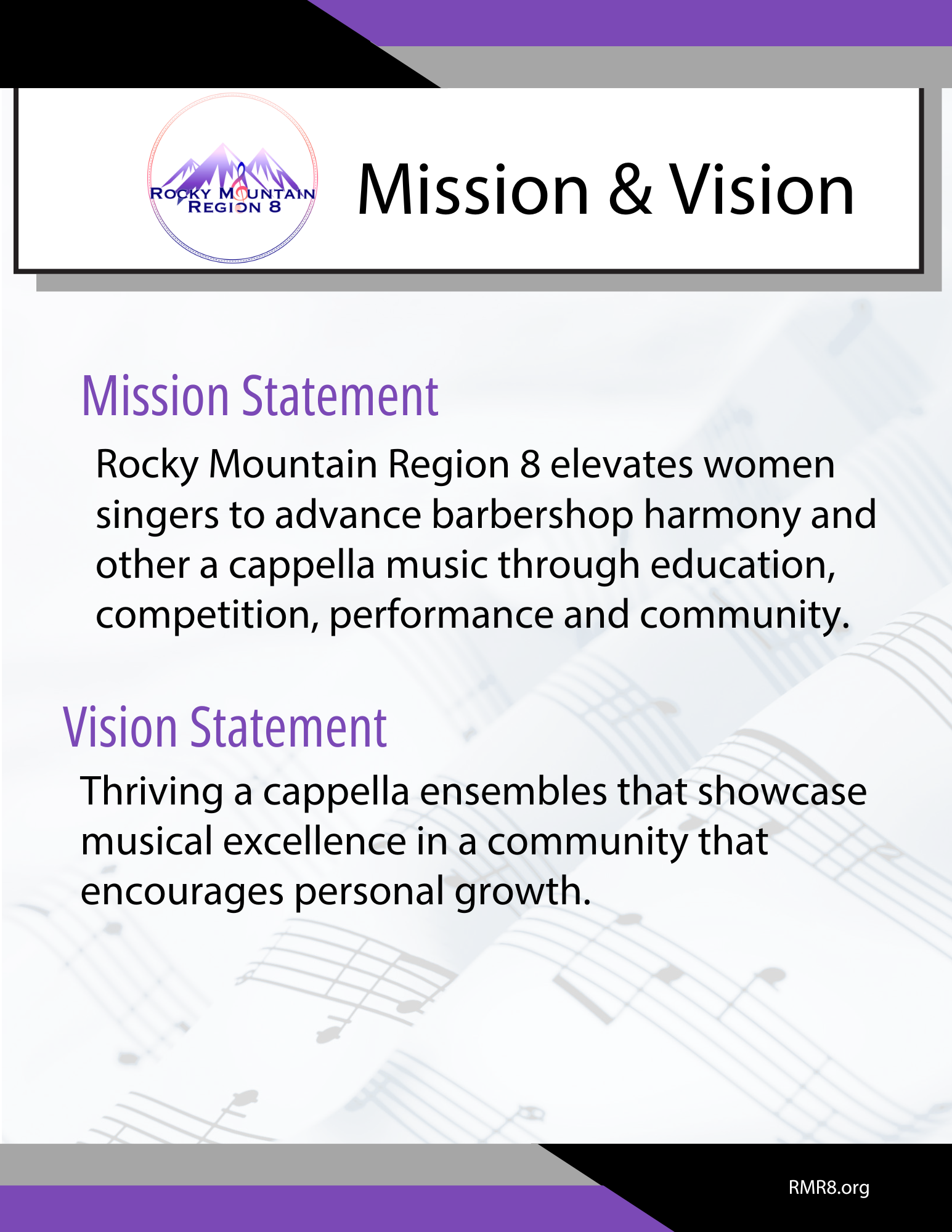 Rocky Mountain Region 8 of Sweet Adelines International is an eight-state region with Chapters in Colorado, Idaho, Montana, Nebraska, South Dakota, and Utah.